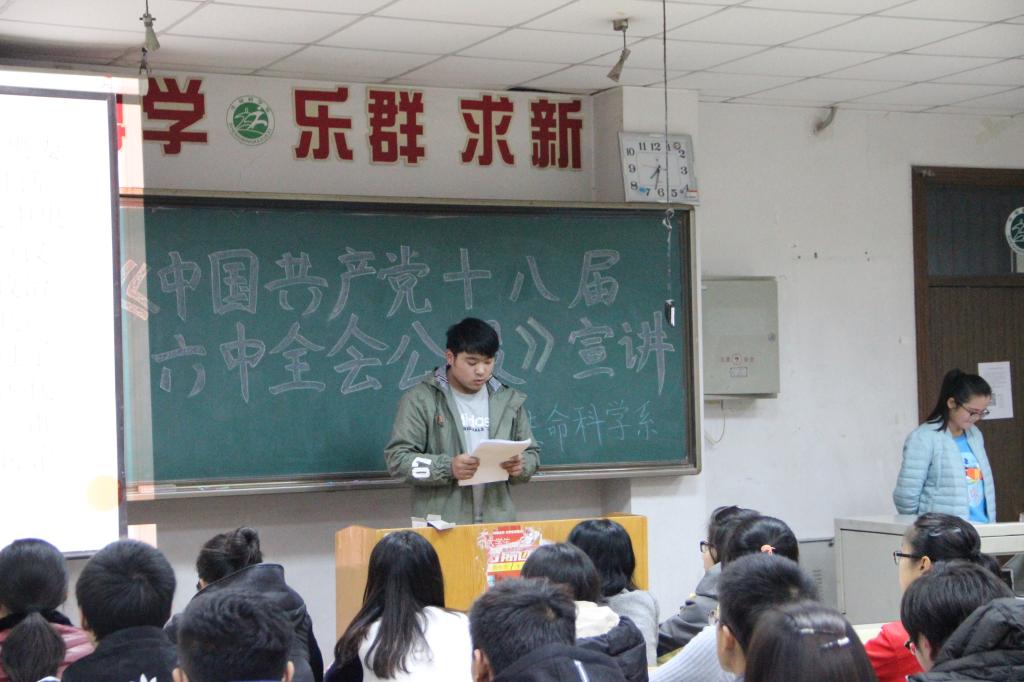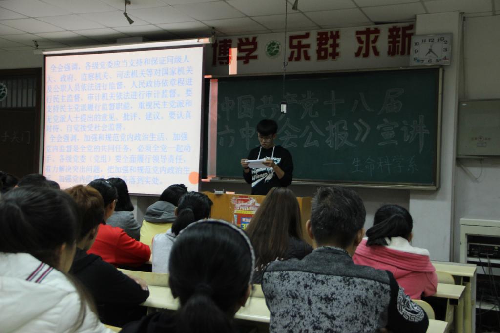 11月3日,生命科学系在8号教学楼306室举办《中国共产党十八届六中全会公报》宣读活动,生命科学系120余名同学参加。
