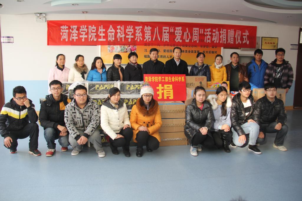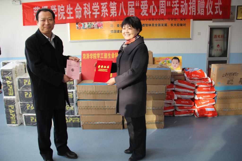 12 月12日上午,由学工部主办,生命科学系承办的以“爱心奉献,温暖人间”为主题的第八届“爱心周”捐赠仪式在菏泽市儿童福利院举行。bevictor伟德国际1946学生处处长王道迎、生命科学系党总支书记张桂荣、副书记王慧丽、团总支书记陈凌云及导员杨恩昌带领十五名学生代表到菏泽市儿童福利院献爱心。为他们带去了洗衣粉、纸尿裤、卫生纸及食物等物品价值8000余元,买东西的钱财都是生命科学系50余名学生会志愿者在大街上募捐所得。福利院向生命科学系颁发了荣誉证书和奖杯。