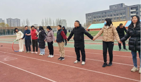在一圈到底团队比赛中,各队教职工手拉着手,用最快的速度和精彩的配合完成传递。