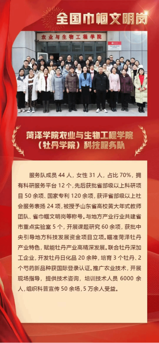 为表彰先进、树立榜样,激励广大妇女自尊自信、自立自强,奋进新征程、建功新时代,积极投身中国式现代化建设,在第115个“三八”国际妇女节来临之际,全国妇联表彰一批在各自领域取得杰出成就的先进个人和集体。我院科技服务队被授予2024年度全国巾帼文明岗称号!