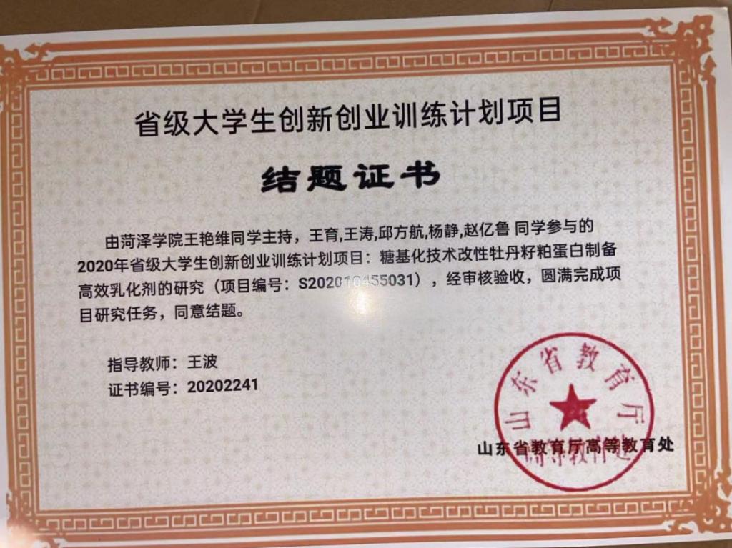 2021年11月所参与的省级创新创业项目“糖基化技术改性牡丹籽粕蛋白制备高效乳化剂的研究”顺利结项,荣获结项证书