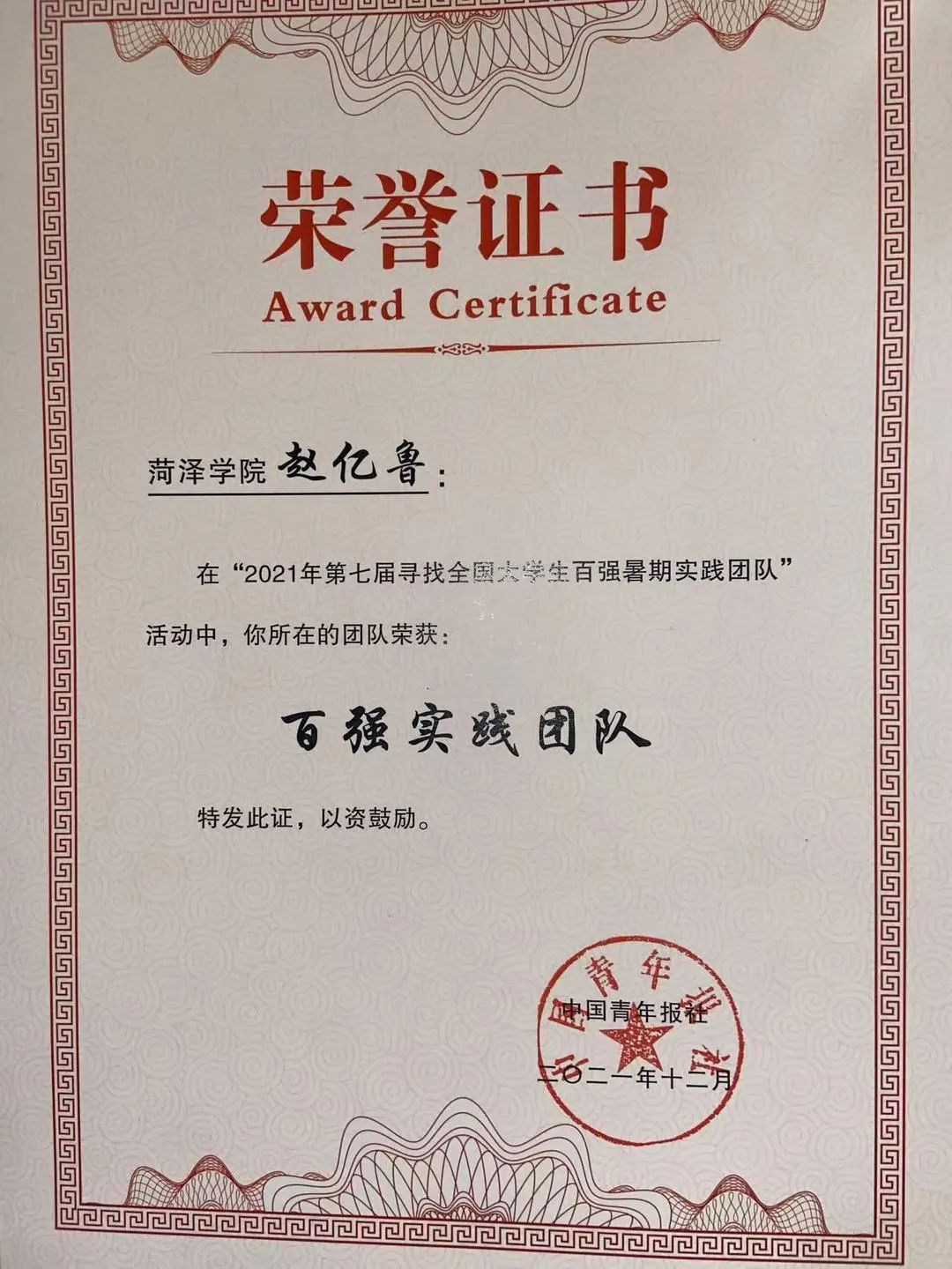 2021年12月所在三下乡团队荣获“全国百强实践团队”称号