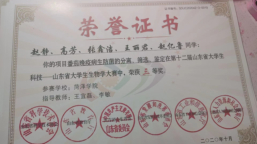 2021年11月所参与的省级创新创业项目“牡丹籽粕蛋白新型应用技术研究”顺利结项,荣获结项证书