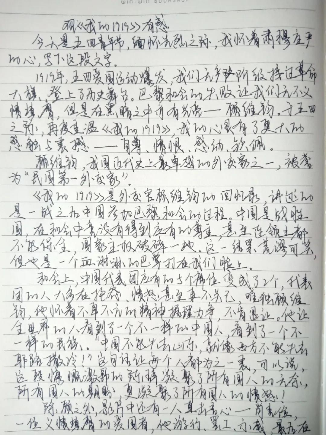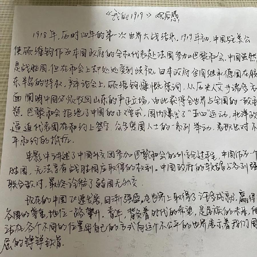 电影《我的1919》讲述的是一战后作为中国代表团的顾维钧参加巴黎和会的始末,再现了中国代表团拒签不平等条约、爱国青年开展五四运动等历史里程碑事件。同学们在电影《我的1919》中重逢于百年间的青春跌宕,汲取中国共产党百年历程中伟大的智慧和力量。观影结束后,同学们对电影所展现的爱国主义精神深深打动,纷纷发表自己的观影感受,大家在发言中表示,作为新时代大学生,应努力践行习近平总书记给我们青年一代的寄语,爱国奋斗、砥砺意志品质,同时作为即将步入工作岗位的毕业生,我们将继续在实践中增长本领,让我们的青春在党和人民最需要的地方绽放绚之花。