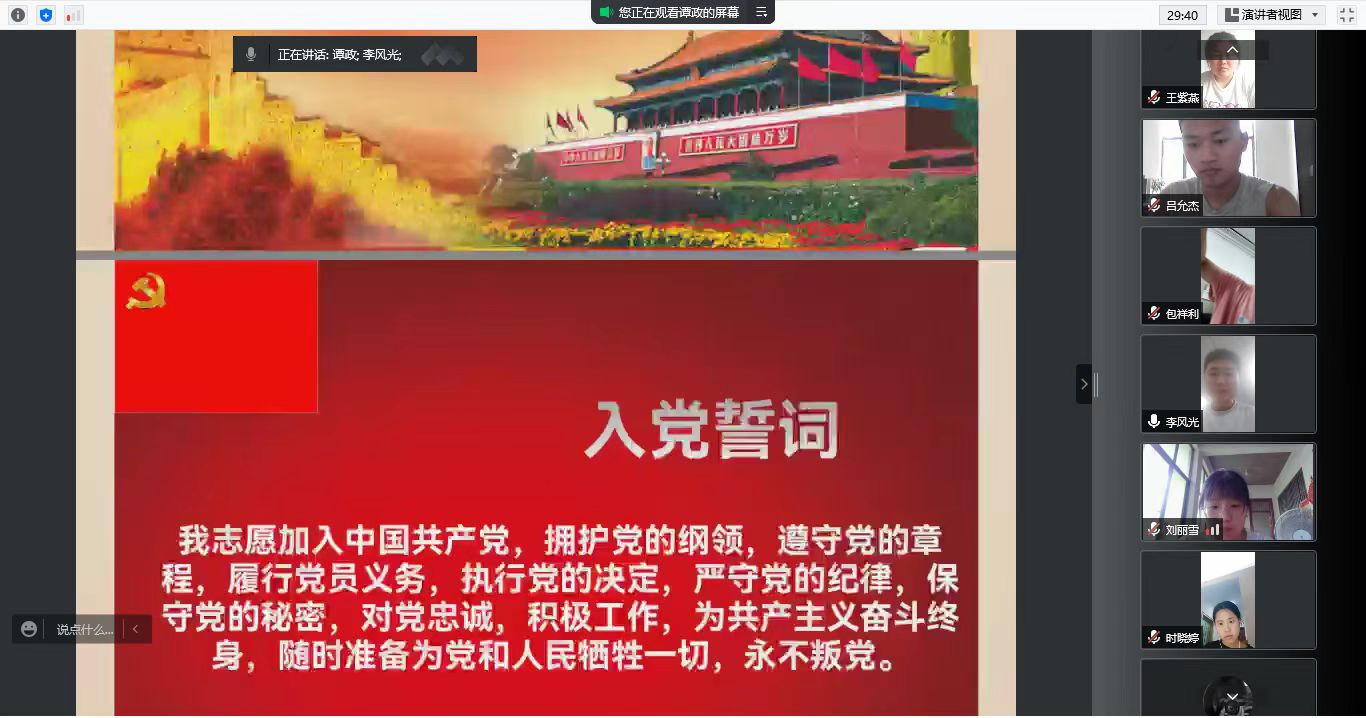 学生第一、第二党支部书记分别带领两个支部的同志学习党章,学习习近平总书记系列重要讲话精神,重温入党誓词,观看《建党伟业》、《红船》等红色电影,通过重温中国共产党成立峥嵘岁月、了解中国共产党成长发展的足迹,进一步坚定了党员的理想信念,锤炼党员的学习、工作作风,提高党员干部的党性修养。