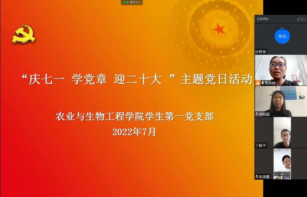 为庆祝中国共产党成立101周年,喜迎党的二十大胜利召开,进一步增强党组织的号召力、凝聚力、战斗力和创造力,教育引导全体学生党员不断增强“四个意识”、坚定“四个自信”、做到“两个维护”,为伟德victor1946学生第一党支部、第二党支部于7月1日开展了“庆七一 学党章 迎二十大”主题党日活动。