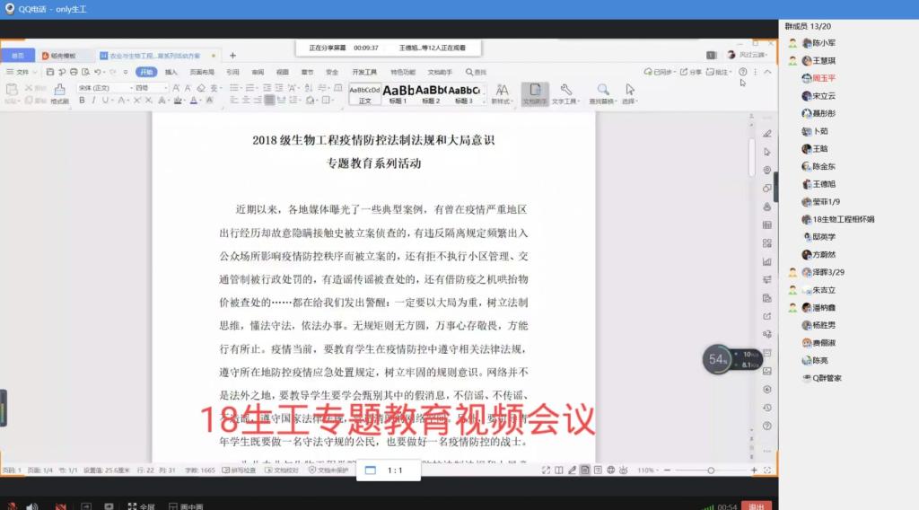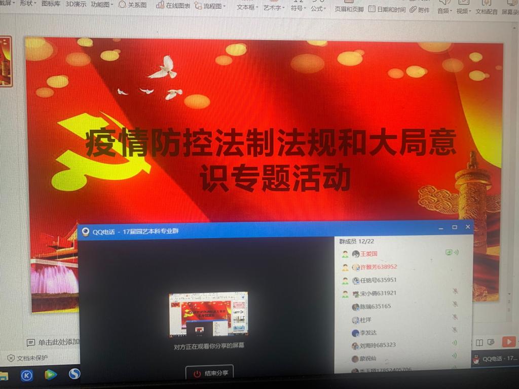 最后,各班班委组织本班举行疫情防控法制法规和大局意识专题教育视频会议。在会议中,班干部认真讲述、同学们认真学习文字材料,积极讨论;随后播放宣传视频,展示手抄报,充分体现出各班级的才艺和风采。在全体同学共同努力下,专题教育活动圆满结束。