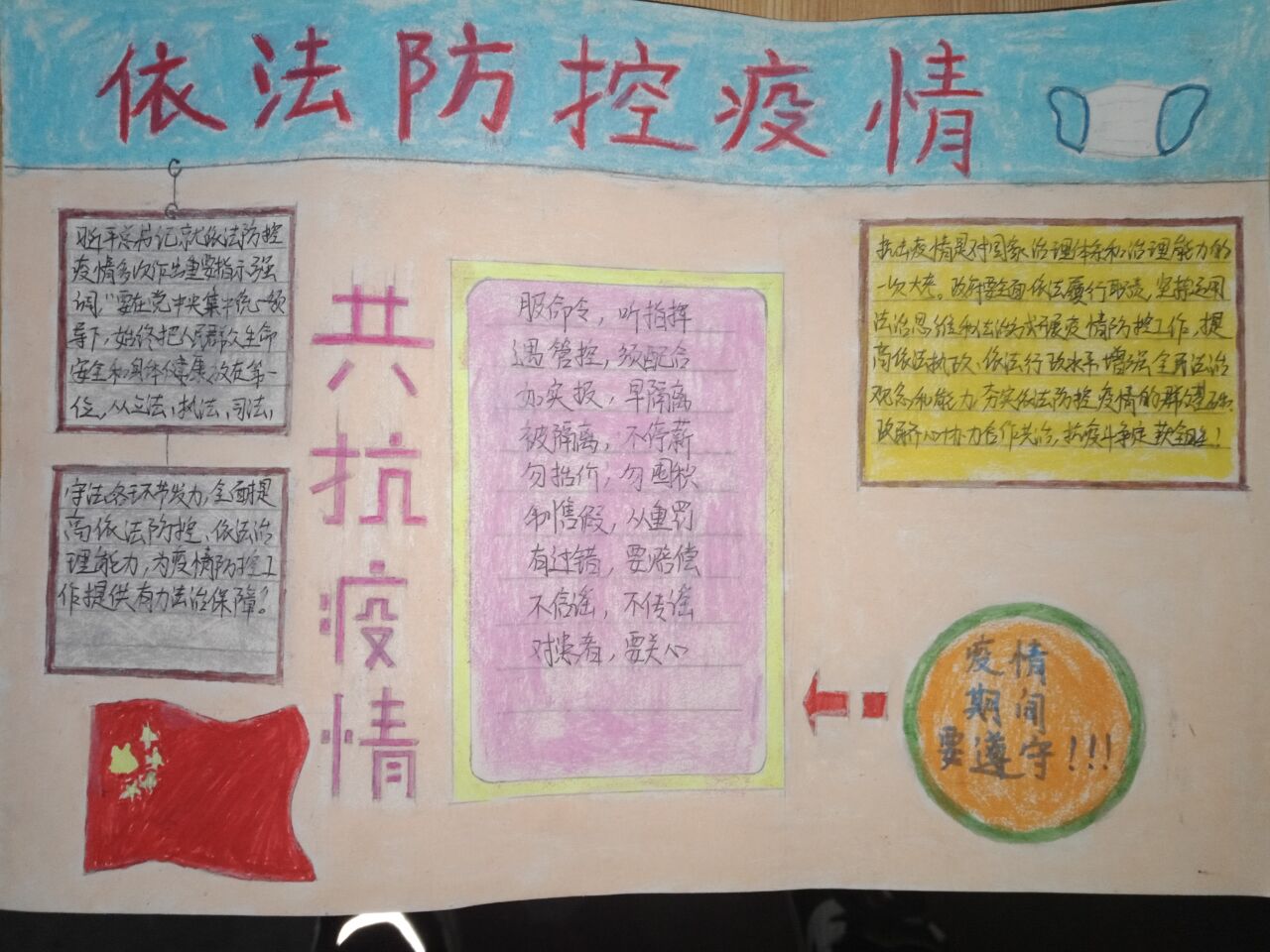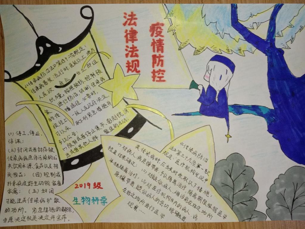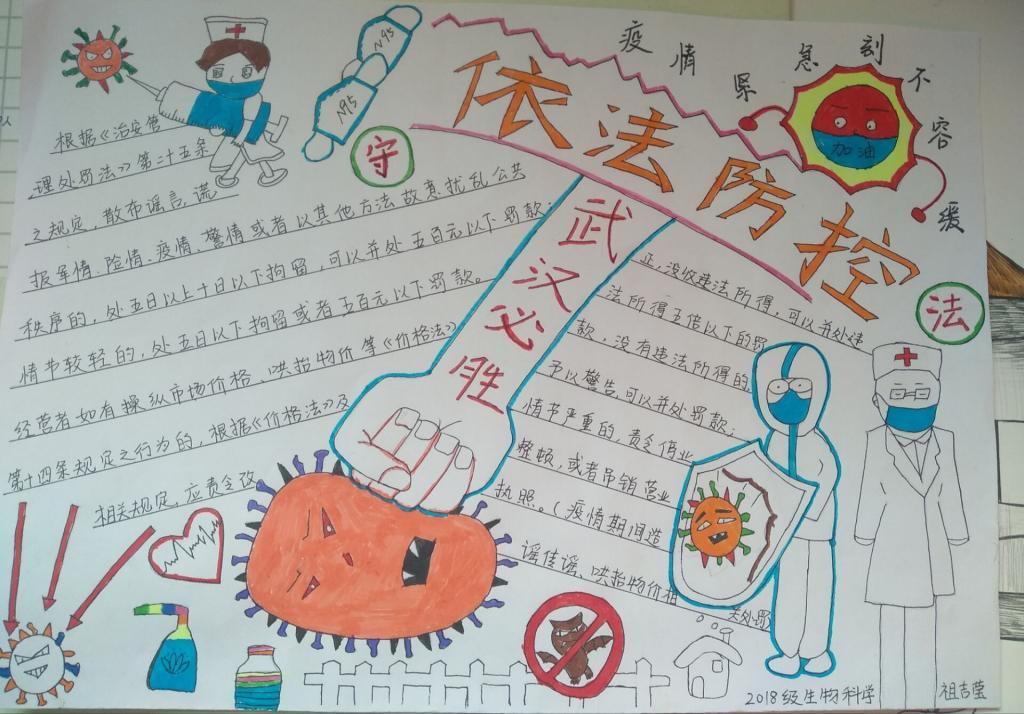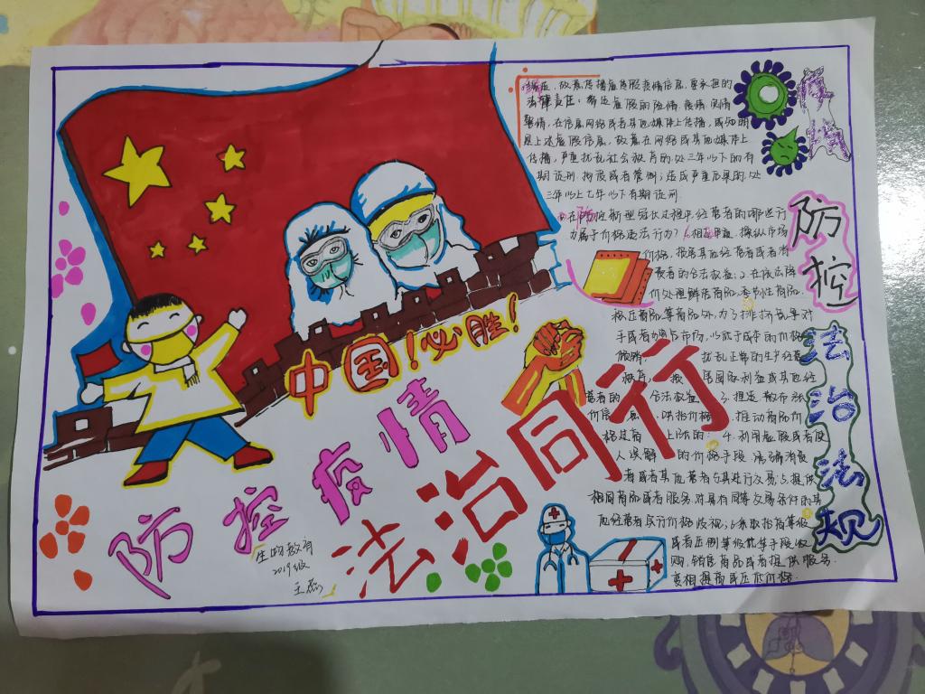 第二阶段,各班班长团支书组织同学绘制了各具特色的专题教育宣传手抄报。手抄报内容丰富,图文并茂。有的介绍法制法规、有的宣传防疫知识、有的抒发美好祝愿…… 一幅幅手抄报体现的是同学们战胜疫情的决心。随后各班制作专题教育宣传视频,在录制过程中,同学们抒发了对白衣天使的崇高敬意,对自然与人类的深刻反思。
