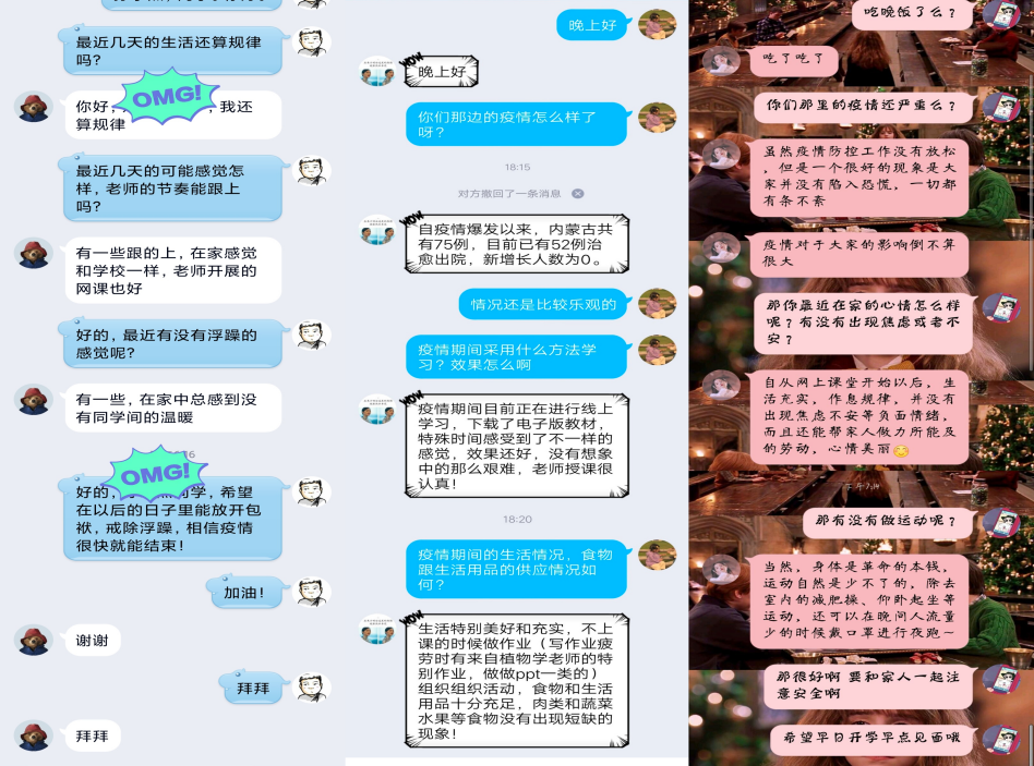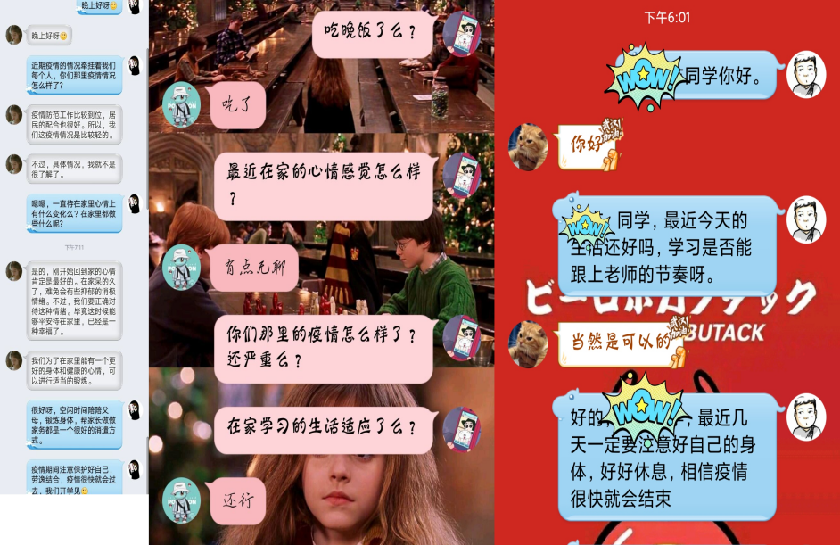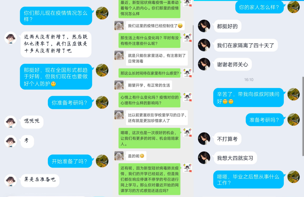 按照学院领导的统一部署,我院开展线上“春雨谈心谈话”活动,通过微信、QQ等线上通讯方式,对我院湖北籍以及其他外地疫情严重地方的学生了解他们心理状况,对因新型授课模式不适应而产生的焦虑、烦躁等情绪,我院心理健康辅导员以及心理健康部成员进行了心理疏导和思想引导,为学生的心理健康提供了保障。同时开通心理健康QQ热线和电话,24小时为同学服务。