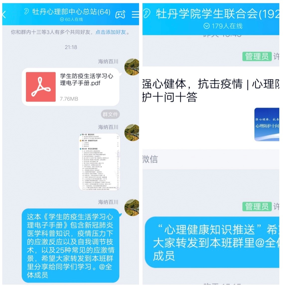 同时开展“心理健康知识推送”活动,在学院学生联合会QQ群以及班级群里推送新冠肺炎疫情知识以及心理健康知识,引导学生了解疫情发生的原因背景、症状表现、鉴别方法、治疗措施,教育引导学生理性认识,消除恐慌,科学防治,敬畏生命,敬畏自然,引导学生携手并进,为疫情稳定后学生返校防疫工作的有序开展做好充分准备。