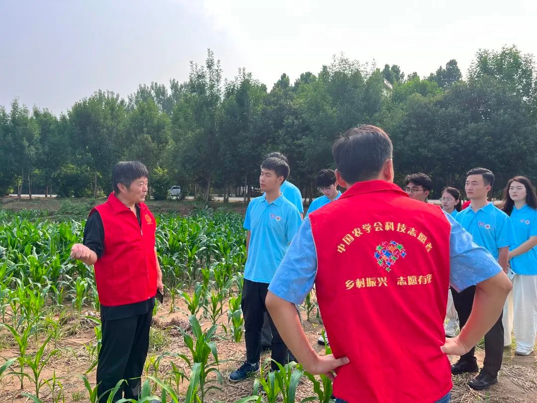 在活动过程中,团队成员走出车间,来到附近的农田,针对该公司当前种植的玉米进行指导。在田间地头,有农户向团队成员发问,近期天气出现旱涝急转情况,应该怎样进行玉米的水肥管理。团队成员结合专业所学,根据地块实际情况提出,水退后立即扶苗洗苗,可合理的进行叶面喷施追肥,促进作物恢复生长。针对其他农户提出的玉米密植以及抗倒伏管理进行着重讲解。此外,团队成员还提醒农户,在雨后应加强玉米锈病、叶斑病及玉米螟等病虫害的监测防治等。