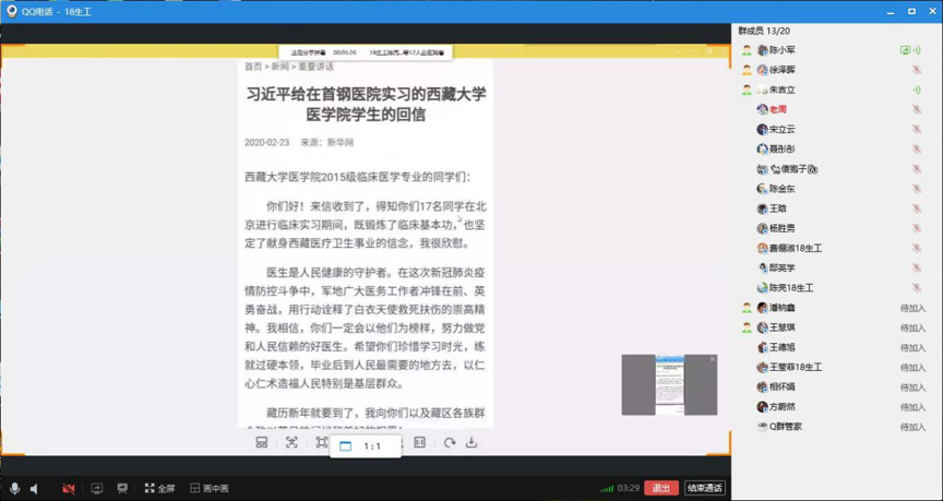 我院采用线上主题团会形式集中学习了习近平总书记重要回信精神,同学们一致认为,总书记的重要回信精神充分肯定了新时代中国青年在防疫工作中的重要作用,体现了新时代中国青年的理想、本领和担当,再次证明了习近平总书记关于青年工作的重要思想是新时代中国青年担当作为的行动指南。并通过班群进行了激烈的线上讨论,反响强烈。全体同学纷纷表示要响应总书记号召,不忘初心、不负厚望、不惧风雨、不辱使命,在校园、西部乃至中华大地的各个角落绽放青春之花。