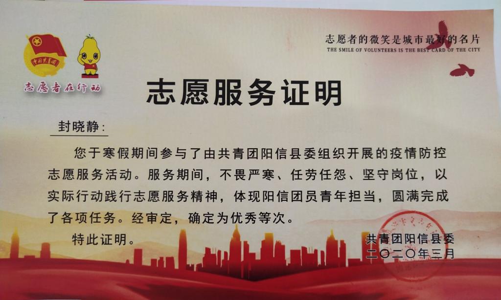 年初,突如其来的新冠肺炎疫情爆发,封晓静积极主动地参与家乡疫情防控志愿活动,为疫情防控贡献出了自己的力量。疫情期间,她每天都坚持参与本村的防疫志愿服务工作。封晓静在抗击疫情志愿服务中主要负责人员排查和登记,宣传防护知识,测体温、做消杀等。她在与老师、同学的交流中写道:这次的志愿者活动一方面锻炼了自己的能力,积累了社会实践的经验;另一方面,也提升了自身的责任感。我们每个人都是生活在国家的大环境里,在国家需要的时候,我们要敢于挺身而出,因为只有国家这个大家庭繁荣昌盛,我们才能有机会去追求自我的梦想,实现自己的价值。