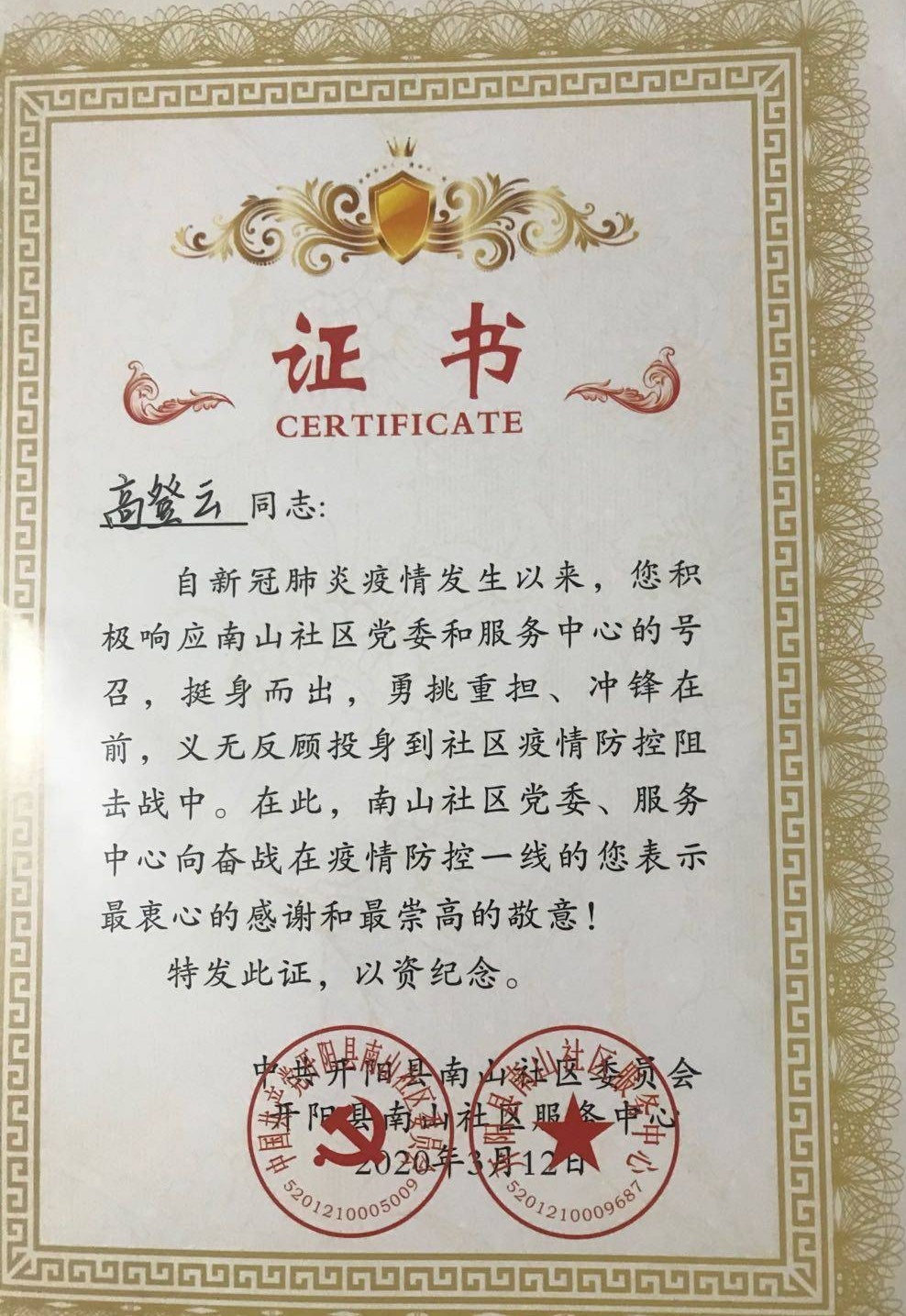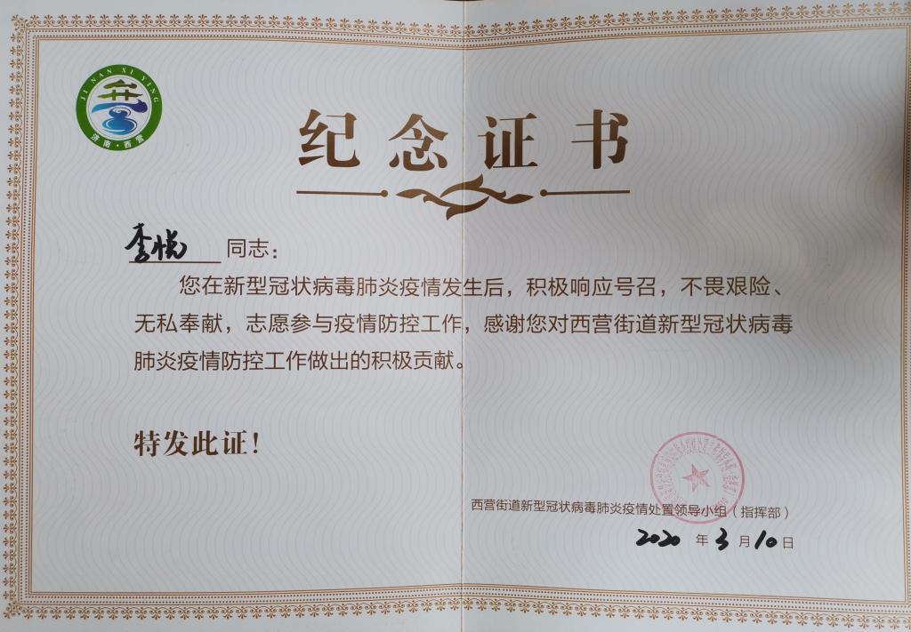 新年伊始,新型冠状病毒引起的肺炎来势汹汹。在和社区联系,征得父母同意后,高登云前往社区报名参与志愿服务,希望能够为社区做点实质性的贡献。在疫情期间,她的主要工作是协助门岗为小区进出人员测量体温、讲解政府最新关于抗疫的政策,纠正居民错误戴口罩的方式等。从一开始居民的不配合、抱怨到后期基本上能严格防护,甚至收到了过往居民的感谢,让第一次深入基层工作这么久的高登云,真正理解到基层工作的不易和辛苦。“历史和现实都告诉我们,青年一代有理想、有担当,国家就有前途,民族就有希望,实现中华民族伟大复兴就有源源不断的强大力量。”她说习近平总书记对青年的寄语一直激励着她勇往直前!