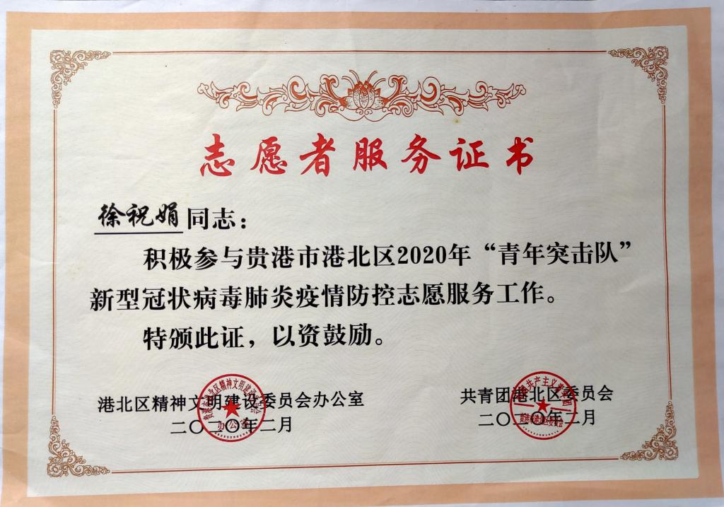 疫情爆发以后,徐祝娟同学在了解到疫情的严重后,志愿加入街道成立的疫情志愿服务队。在保证自身安全的情况下,徐祝娟在街道防控监测点开始了她的抗疫工作,为来往行人普及新冠病毒知识、讲解疫情的发展情况、为卡点进行日常消毒、劝阻行人等。在工作中,徐祝娟同学与其他大学生志愿者们一起挺身而出、冲锋在前,以实际行动加入到抗疫行动中去,为遏制疫情传播扩散、夺取疫情防控斗争胜利贡献着自己的青春力量。