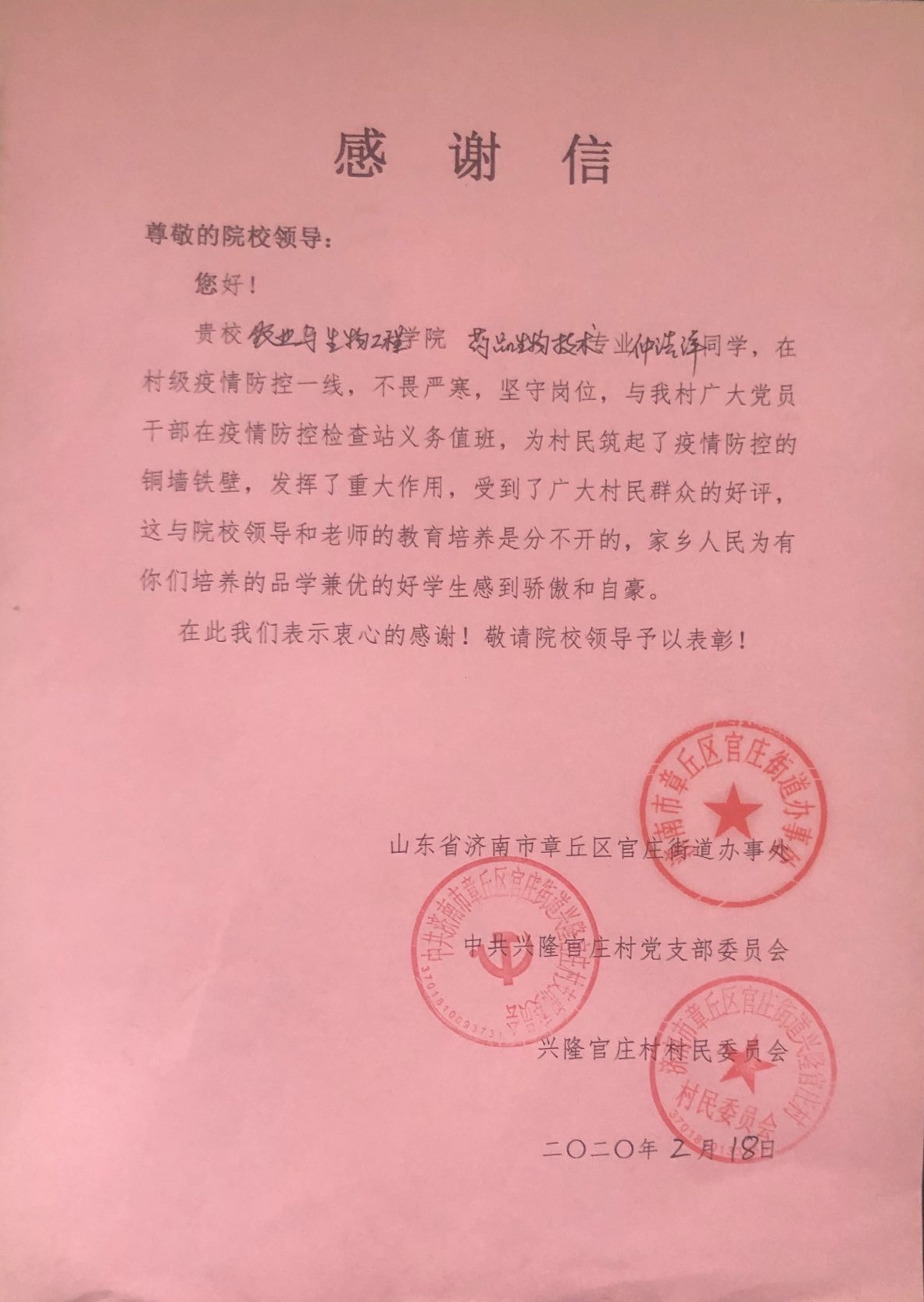 面对新型冠状病毒肺炎疫情防控的严峻形势,仲浩洋同学积极响应村党组织号召,在家长支持下,参加了兴隆官庄村疫情防控志愿者行动。在兴隆官庄村疫情监控站点,仲浩洋与其他检查人员一道,对出入人员登记造册、测量体温,每一项工作都非常认真负责。他用自己的实际行动,表明了众志成城、万众一心、坚决打赢这场没有硝烟的疫情阻击战的坚定决心。他说,作为一名共青团员,疫情面前,职责所在,只有认真值好每一班岗,才能把本村防疫工作做实做细,才能切实阻断传播途径,保障当地居民健康。