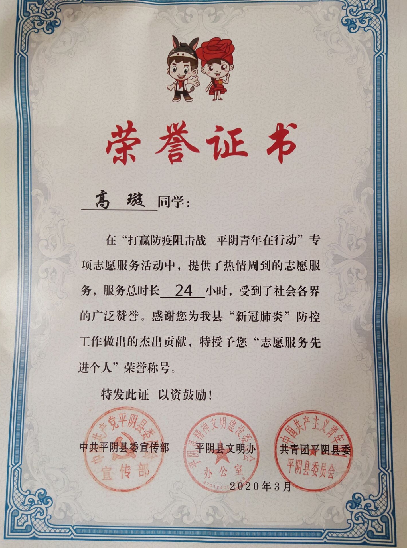 新冠肺炎疫情发生以来,伟德victor1946多名学生响应国家号召,不畏疫情、勇于担当,在做好自身安全防护的前提下,积极有序投身到各地区的疫情防控阻击战中,开展村镇守护、防疫消杀、知识宣传等志愿服务,用实际行动展现青年一代的责任与担当,汇聚起战“疫”的青春力量。志愿者们在抗击疫情服务中用坚守和奉献彰显“90后”“00后”的担当,获得了各单位的表扬表彰。