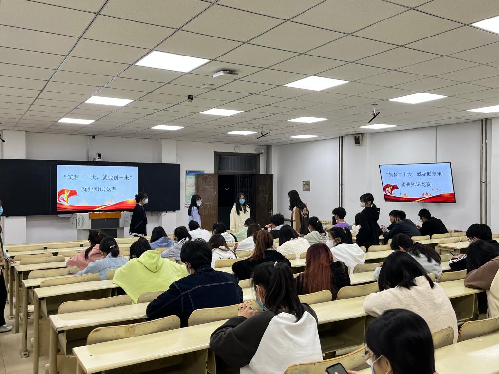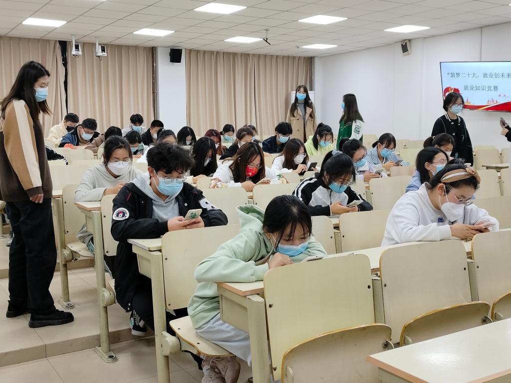 为贯彻落实习近平总书记在党的二十大报告中“实施就业优先战略,强化就业优先政策”的重大部署,10月31日晚上,伟德victor1946学生联合会就业部在9212教室开展“筑梦二十大,就业创未来”就业知识竞赛活动。活动由郭锐颖老师、自律会主席李子陶以及学生联合会部分部长组成评委团进行监考。