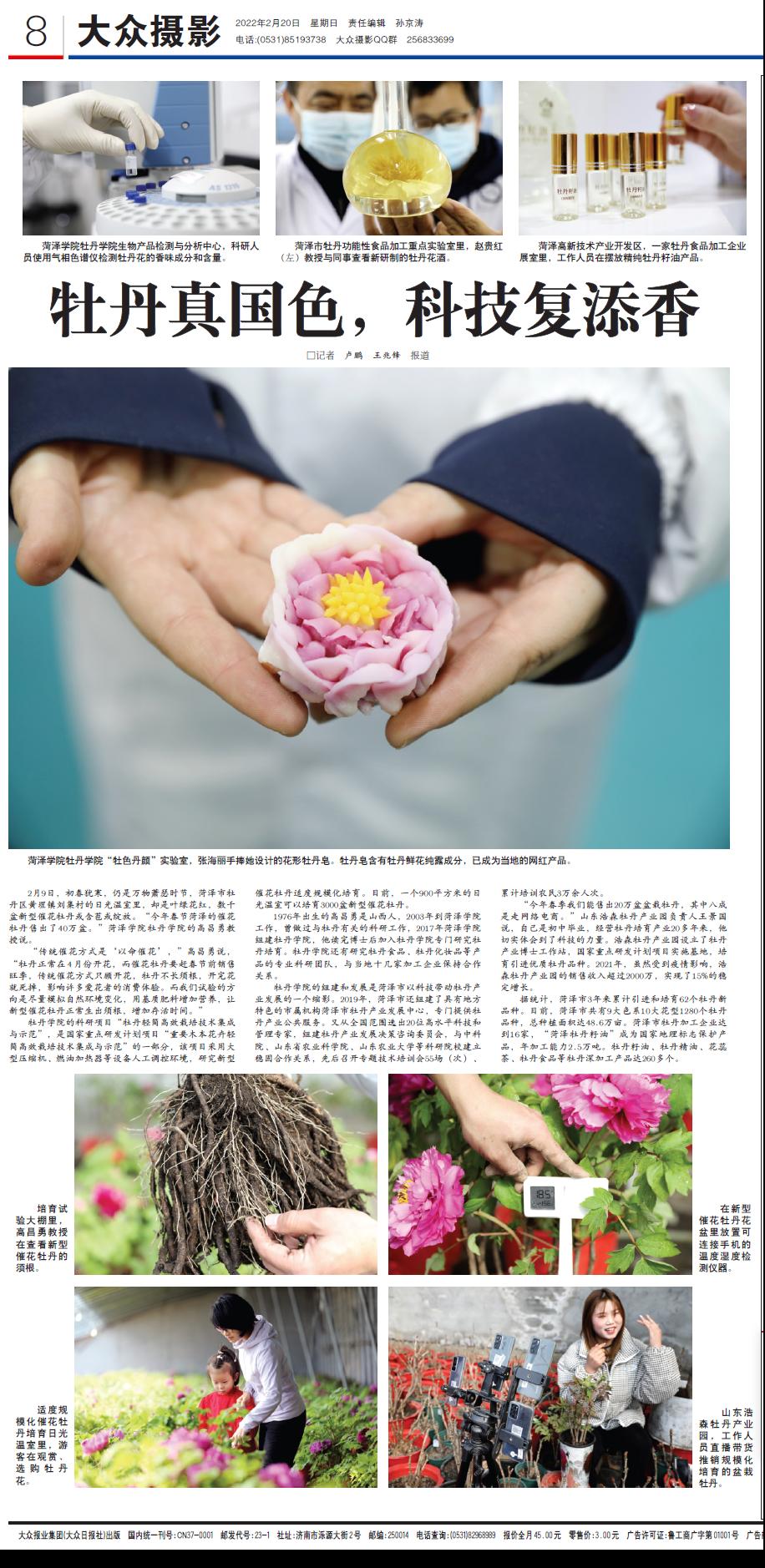 2月20日,《大众日报》第8版刊发了《牡丹真国色,科技复添香》的报道,宣传报道了我院服务地方,为菏泽牡丹产业发展提供科技支撑。
