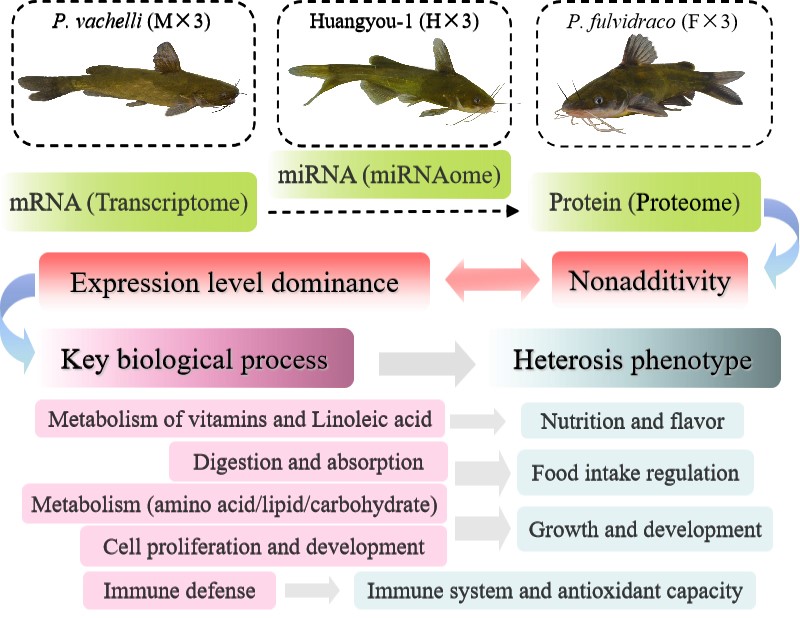 杂交黄颡鱼“黄优1号”具有生长速度快、抗病能力强、耐运输等优点,为了充分利用杂种优势培育黄颡鱼养殖优良品种,该研究运用mRNA-seq、miRNA-seq、蛋白质组、Parallel reaction monitoring等测序技术从转录、转录后和蛋白质水平整体地研究杂交种及其亲本间基因和蛋白质的差异表达及变化规律,针对杂交优势调控相关miRNA与杂交种靶基因的调控关系进行分析,从而综合解析杂交黄颡鱼“黄优1号”杂种优势的分子遗传机制。该研究成果不仅对鱼类杂种优势的有效利用和鲿科鱼类杂交育种研究具有重要的理论意义和实用价值,而且对今后解析其他鱼类的杂种优势遗传机理研究具有重要的借鉴和指导作用。